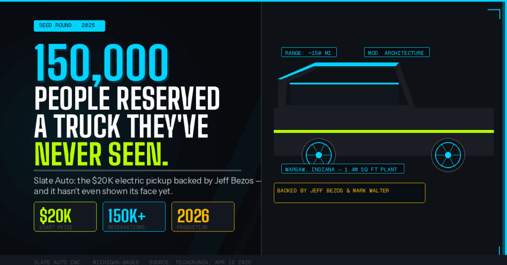 The three‑year‑old startup has raised seed funding backed by Jeff Bezos and Mark Walter. The Michigan‑based, three‑year‑old startup is developing an ultra‑cheap, customizable electric pickup that starts under $20,000, offering modular Transformer‑like design options for paint, seating and silhouette, and it already boasts 150,000+ refundable reservations. Despite the $7,500 federal EV tax credit expiring, the company plans to produce its vehicles in a 1.4‑million‑square‑foot former printing plant in Warsaw, Indiana, targeting a late‑2026 production start. The modular architecture also allows buyers to customize everything from power windows to interior finishes, while the $7,500 federal EV tax credit initially helped meet the sub‑$20,000 price target.The funding round includes prominent investors Jeff Bezos and Mark Walter, the Los Angeles Dodgers owner, along with private‑equity firm Slauson & Co., which participated in the seed round. The capital will be allocated to building the Indiana factory, scaling production, and finalizing the modular truck platform. TechCrunch reported on April 12 detailing the secretive startup’s progress and early traction. The company emphasizes that the factory’s 1.4‑million‑square‑foot space was chosen for its low cost and existing infrastructure, allowing rapid setup. Additional investors include unspecified corporate venture partners, though their identities remain confidential. The use of funds also supports hiring key personnel and marketing the truck to reservation holders.Bezos Backing Sparks Seed Round